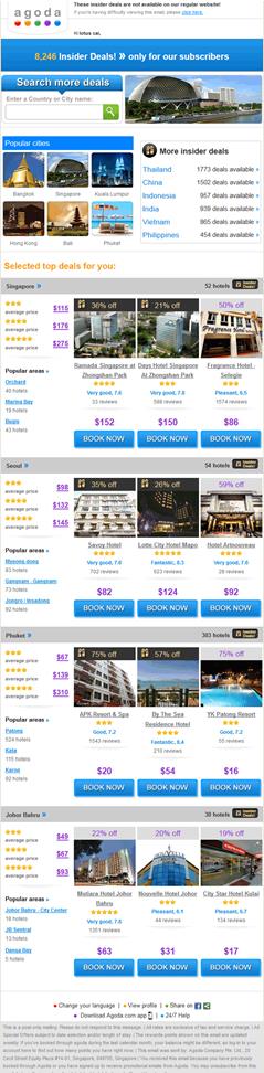 2)Agoda在邮件设计上主要分为三大块:热门城市推荐、更多城市推荐、单一地区及城市的酒店详细推荐。在布局上也遵照“图片+文案描述+ CTA按钮“的形式,图片一如既往的干净漂亮。与Booking不同的是,Agoda的邮件在”地域和酒店“的内容布局上更为合理,没有因大失小,如在热门城市推荐、更多城市推荐栏目中,以地域为导向的内容仅仅提供了该地域的所有优惠酒店总数,而”单一地区及城市的酒店详细推荐“才是邮件的重点,该栏目在布局上,同样以区域作为划分标准,在每一区域中,主推该地区最具吸引力的酒店,从而实现有效的酒店促销,牢牢抓住用户的眼球。比Booking棋高一着的是,Agoda置于邮件左上角的宽大醒目的站内搜索引擎,相比Booking位于邮件邮件顶端的细条搜索框,更能激起用户搜索点击的冲动。