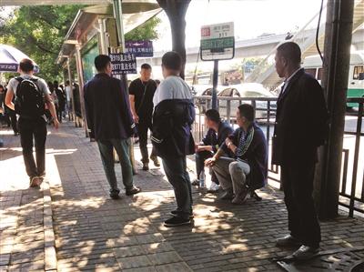在881公交德胜门站台旁,四五名身穿公交制服的男子围坐在公交站旁
