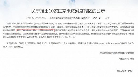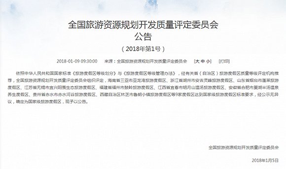 国家旅游局网站1月9日的公告称,依照中华人民共和国国家标准《旅游度假区等级划分》与《旅游度假区等级管理办法》,经有关省(自治区)旅游度假区质量等级评定机构推荐,全国旅游资源规划开发质量评定委员会组织评定,海南省三亚市亚龙湾旅游度假区、浙江省湖州市安吉灵峰旅游度假区、山东省烟台市蓬莱旅游度假区、江苏省无锡市宜兴阳羡生态旅游度假区、福建省福州市鼓岭旅游度假区、江西省宜春市明月山温汤旅游度假区、安徽省合肥市巢湖半汤温泉养生度假区、贵州省赤水市赤水河谷旅游度假区、西藏自治区林芝市鲁朗小镇旅游度假区等9家度假区达到国家级旅游度假区标准要求,经公示无异议,确定为国家级旅游度假区。