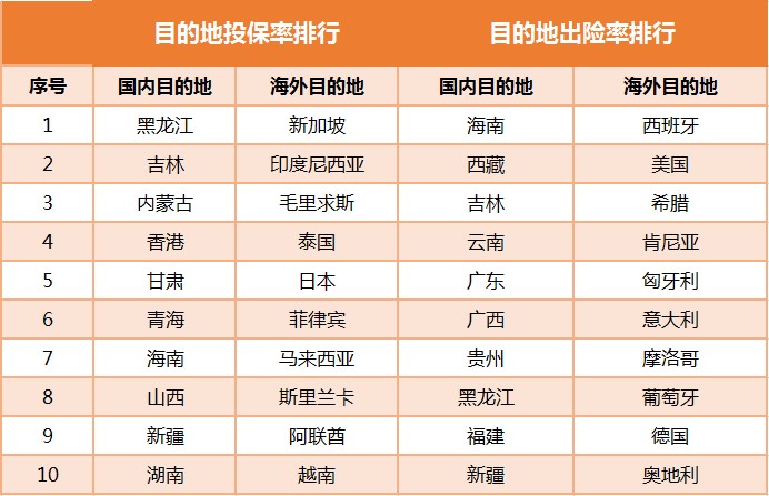 从目的地投保率来看,黑龙江、吉林、内蒙古等城市排名靠前,海外目的地中的东南亚、海岛等热门旅游地的投保率也比较高,这也反映了出游客对这些目的地的风险预期。