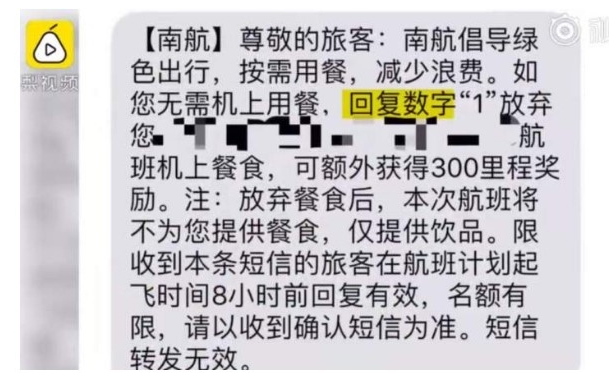 “回复数字‘1’放弃航班机上餐食,可额外获得300里程奖励……”近日,有乘客在预定机票后,收到了南航发来的短信,上面写着取消餐食可获得额外里程奖励。