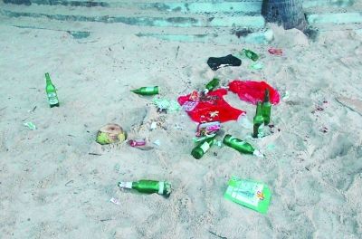 20日早上,记者再次来到大东海沙滩时,环卫工人和大东海景区的商户们正在清理沙滩上的垃圾。记者看到,数不清的啤酒瓶散落沙滩上,有的甚至被摔碎,还有白色餐饮塑料盒、塑料袋等垃圾。