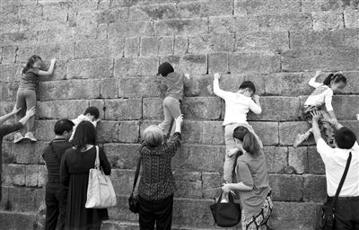 昨日,几名小朋友在家长的托举下,攀爬已有六百多年历史的南京明城墙。新华社发
