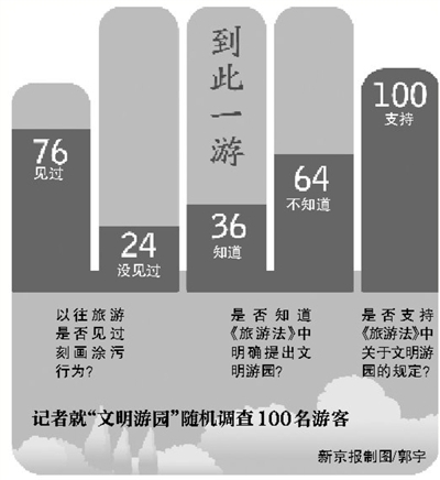 记者随机对100名游客进行调查,结果显示,绝大多数人认为,应该对在文物和名胜古迹上乱写乱刻的行为严处。“修复这些乱写乱画,消耗很多人的时间和公共财力,应当严处。”多名游客说。