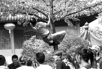 昨日,一游客在苏州玄妙观入口处爬上银杏树摘银杏。新华社发