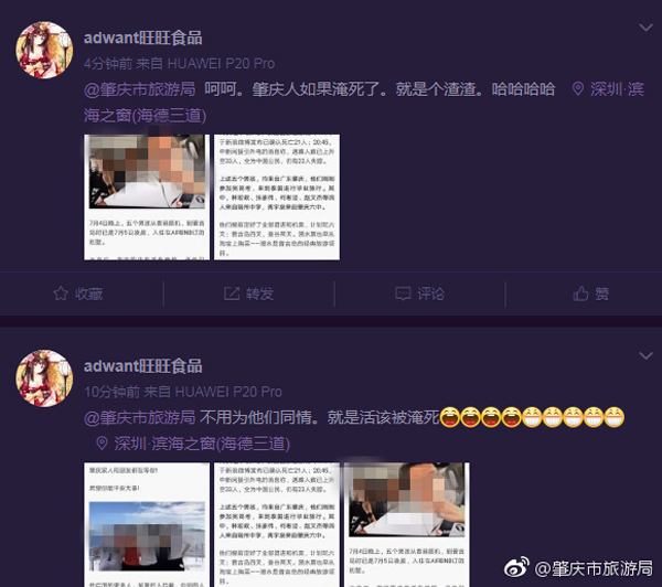 7月9日13时41分,@肇庆市旅游局 附上一张@狗蛋陈蛋蛋 的个人微博主页截图,并称,“感谢微博,公正及时处理了这个渣渣,此前竟无故对我肇庆在泰沉船中不幸遇难人员发表了侮辱性语言,并还有地域攻击,简直无人性。为了受害者家属,之前我们挂的截图已经隐藏,希望少点网络害虫,多点清朗阳光。”