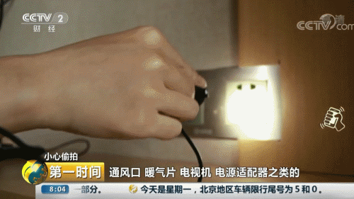 杭州市民云飞:拿一个小手电把外露的,有孔的那些地方全都照进去看,通风口、暖气片、电视机、电源适配器之类的,外露的全都要去看一遍,包括沐浴露瓶子之类的。因为针孔摄像头所有的镜片前面,都有一个镀膜的,镀膜的颜色其实是比较特别的,一般是那种绿的、蓝的,通过一个镜片反光的判断方式,就能知道,这个东西有可能是一个镜头。