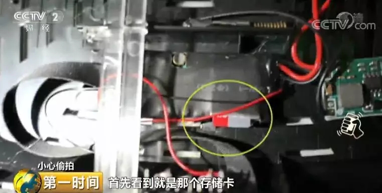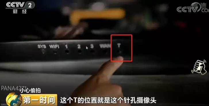 杭州市民云飞:观察一下真实的针孔摄像头,我当时拧螺丝的时候,手感就特别松,所以就觉得有点不对。打开路由器之后,首先看到就是那个存储卡,你一看到存储卡就可以肯定,这个东西肯定是有问题的,存储卡一边连了一个可疑的排线,这个排线连接着一个针孔摄像头,这个T的位置就是针孔摄像头。