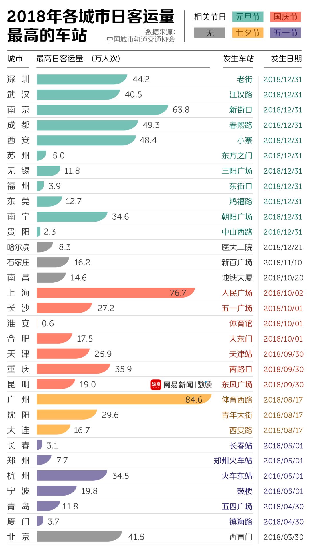 2018年12月31日的南京新街口站,客流量高达63.8万人次。而深圳老街、西安小寨、成都春熙路等站的当天流量,也在40万人次以上。