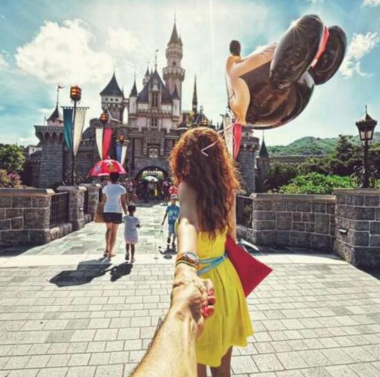 俄罗斯艺术家欧斯曼(Murad Osmann)的摄影作品《跟我走》系列之一:《跟我走……到香港迪士尼乐园》