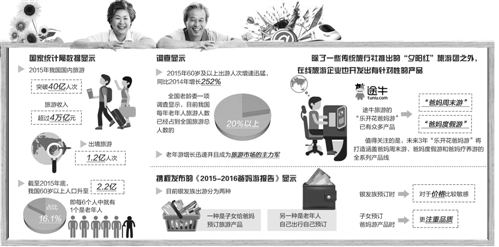 近年来,随着收入水平的提高和生活观念的转变,越来越多人退休后加入到旅游大军,消费水平也不断提升。国家统计局数据显示,截至2015年底,我国60岁以上人口升至2.2亿,占比16.1%,即每6个人中就有1个是老年人。