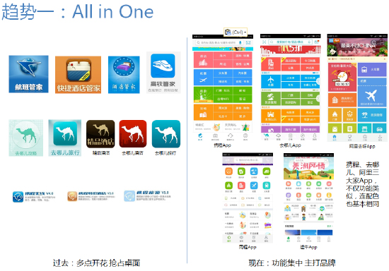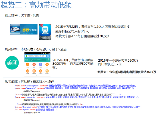 旅游链条中,高频次的环节太少了,所以要时刻提防其他高频应用“跨界而来”。比如,携程在2015年以1亿人民币收购的蒜芽科技,公司只有8个人,但其占据了火车票这个比飞机票还要高频的接触点,所以价值不菲。至于新美大那就更不用说了,本地高频次的消费场景,加上预付的消费习惯很容易导入到旅游领域。去哪儿被携程收购后,新美大的酒店业务更是进入快速增长阶段,同时还在机票领域积极布局,收购酷讯、投资必去,大有成为新一极的趋势。