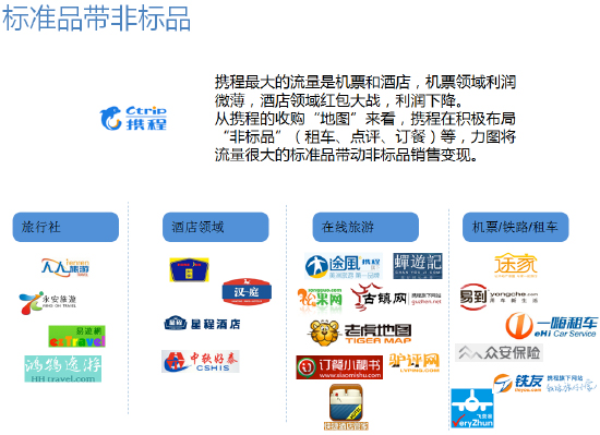 越是标品,利润越低。单纯靠标品的利润,谁都过得不好。机票领域现在已经是哀鸿遍野了,那为什么同程和途牛还要高调宣布进军机票和酒店领域呢?其中的主要的逻辑就是,这些标品虽然利润低,但是会带来流量,有了流量就可以根据信息维度和销售难易程度搭售其它高利润的产品了。窃以为,机票搭售的顺序是:保险>租车>酒店>接送机等。