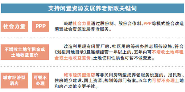 近两年,中央多次表态鼓励各界利用闲置资源发展养老服务,而本次,民政部等11部门更将该思路进一步落实到政策中,对盘活资源的方式进行了具体的细化。根据《通知》,各地要充分挖掘闲置社会资源,引导社会力量参与,将城镇中废弃的厂房、医院等,事业单位改制后腾出的办公用房,乡镇区划调整后的办公楼,以及转型中的党政机关和国有企事业单位举办的培训中心、疗养院及其他具有教育培训或疗养休养功能的各类机构等,经过一定的程序,整合改造成养老机构、社区居家养老设施用房等养老服务设施,增加服务供给,提高老年人就近就便获得养老服务的可及性。