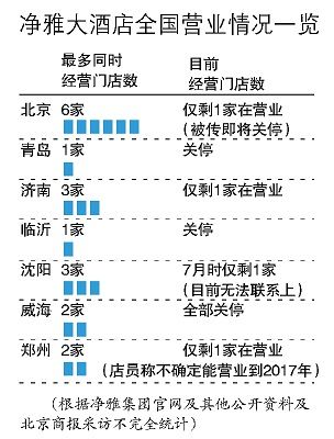 记者调查后了解到,去年年初还对外称在全国有26家门店的净雅大酒店,目前确定在营业的门店只有3家,且其中2家被传有关店意向。此外,还有1家门店无法联系上,暂时不能确定是否处于正常营业状态,净雅大酒店的门店几近全部关停。