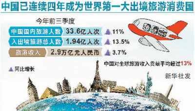 记者12日从正在此间举行的2016中国国际旅游交易会上获悉,今年前三季度,中国国内旅游人数33.6亿人次,入出境旅游总人数1.94亿人次,旅游收入2.9万亿元人民币,同比分别增长11%、13.5%和3.7%。中国已连续四年成为世界第一大出境旅游消费国,对全球旅游收入贡献平均超过13%。