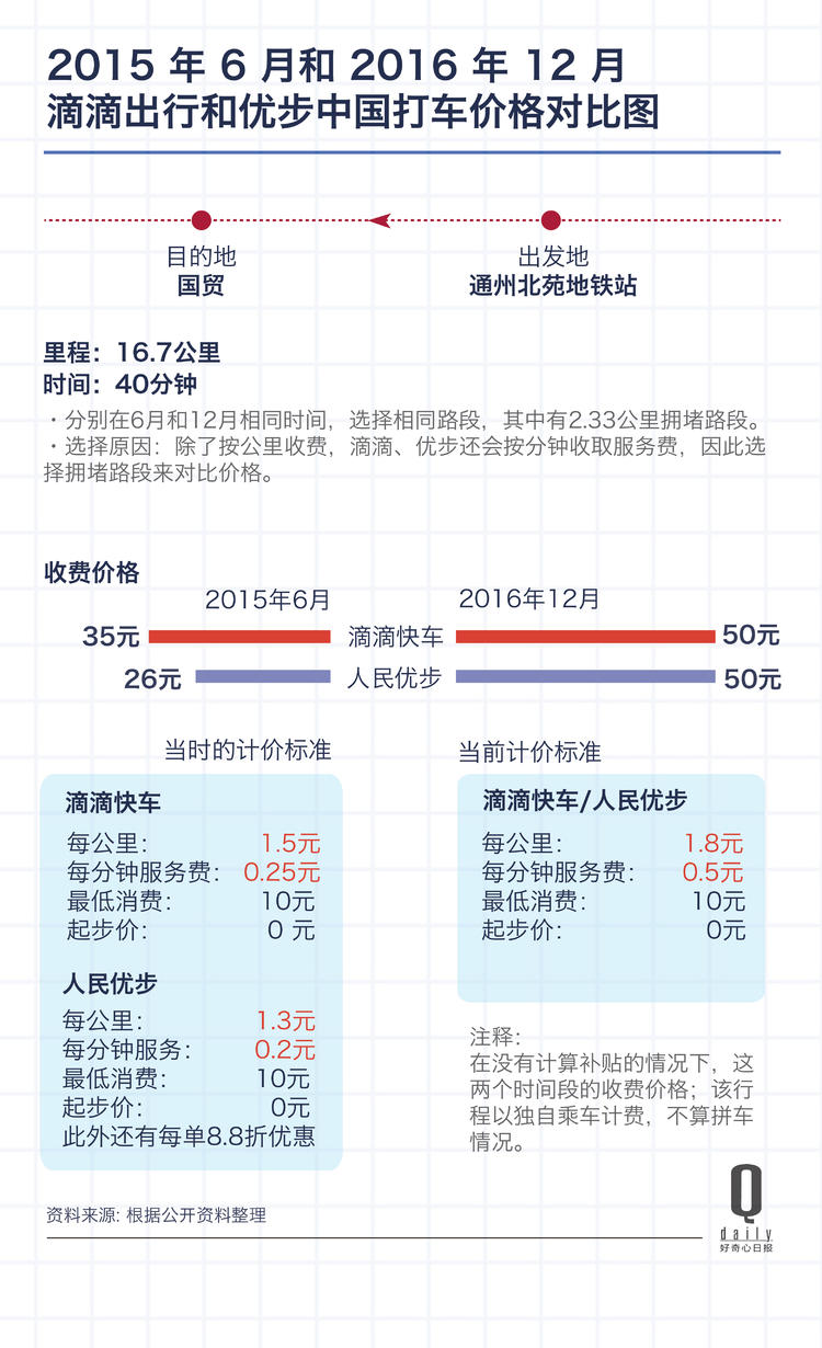 用户流失有一些涨价的原因,比如滴滴、优步中国合并计价标准上调了。同样一段 16.7 公里的路程,滴滴出行去年和今年的价格差距在 15 元。