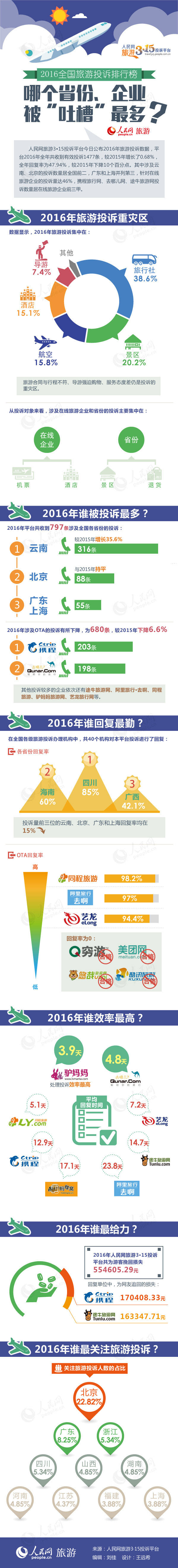 人民网旅游3·15投诉平台今日公布2016年旅游投诉数据,平台2016年全年共收到有效投诉1477条,较2015年增长了0.68%,全年回复率为47.94%,较2015年下降10个百分点。其中涉及云南、北京的投诉数量居全国前二,广东和上海并列第三,针对在线旅游企业的投诉量达46%,携程旅行网、去哪儿网、途牛旅游网投诉数量居在线旅游企业前三甲。
