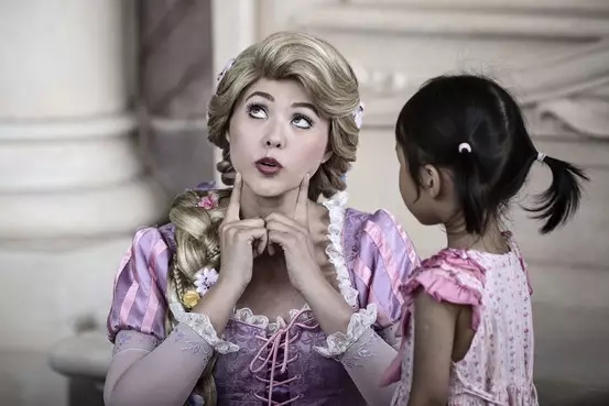 上海迪士尼公园一位扮成长发公主的演员与小女孩讲话。图片来源:Qilai Shen/Bloomberg News