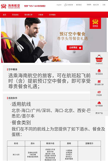 点击短信中网址后,跳转到海航餐食手机预定网页,并展示该服务主要内容: