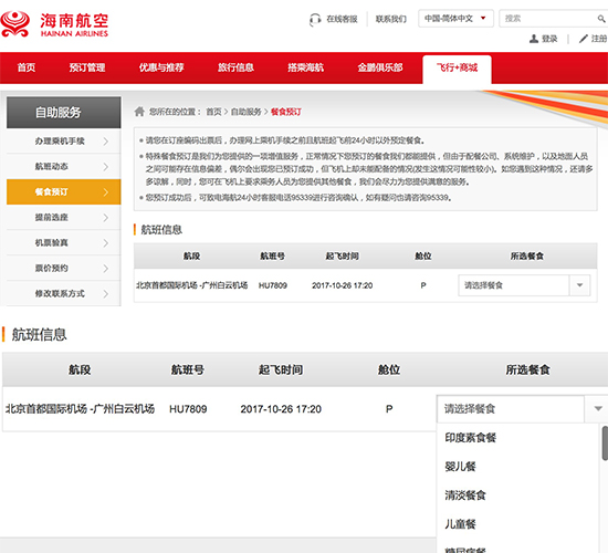 此时,可以选择餐食了,而在北京—广州航线,目前只见到了下面的餐食: