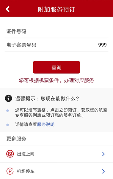 一、国航的境外上网与机场停车服务,通过国航APP的附加服务,可以看到如下产品: