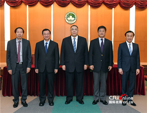 澳门行政长官崔世安、文化部部长雒树刚、中联办主任郑晓松、国家文化局局长刘玉珠、社会文化司司长谭俊荣合影
