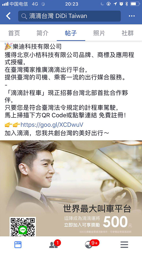 社交网站Facebook账号滴滴台湾(DiDi Taiwan)的公告称,台湾乐迪科技有限公司获得北京小桔科技(即滴滴出行)品牌商标及应用程序的授权,在台湾独家推广滴滴出行平台,“提供台湾的司机、乘客一流的出行媒和服务。”