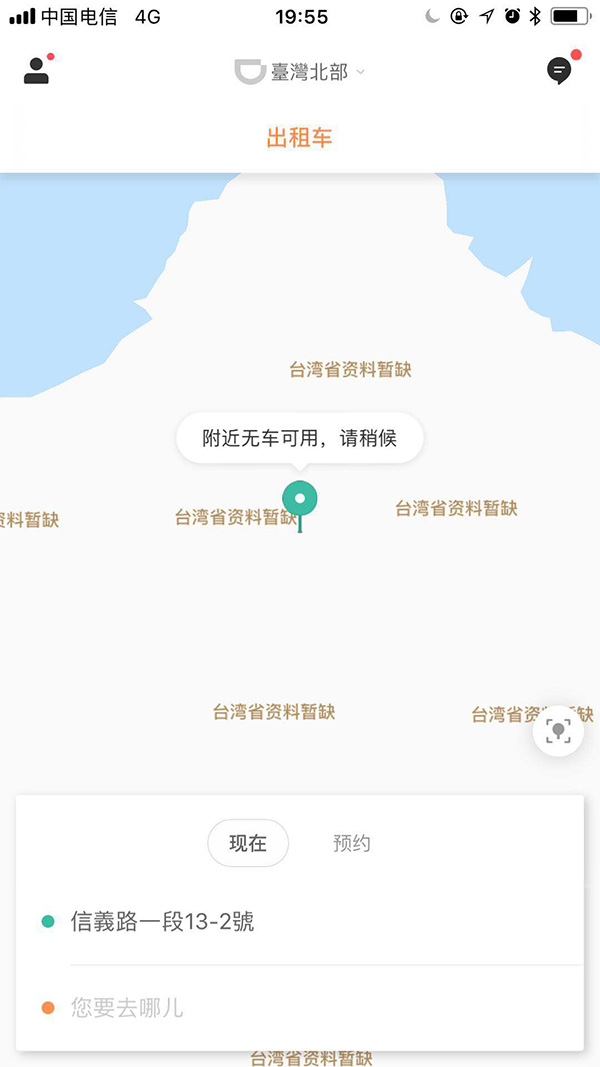 记者体验滴滴出行用户端发现,目前新增台湾地区的叫车选项,滴滴出行应用已经上架台湾当地应用市场,目前仅支持简体中文与英文操作界面,叫车地图仍为空白。