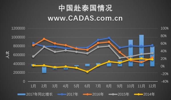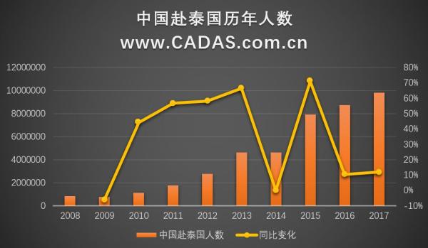 2017年中国赴泰国980.57万人次,同比增长5.26%,创历史新高。中国赴泰国规模已由10年前的不到100万人次增长到接近千万。中国持续保持泰国第一大入境目的国家,同时泰国也是中国第一大出境目的国家。2016年第四季度,受到泰国国内整治旅游业及国王逝世的影响,中国赴泰人数骤减,2017年已有逐步恢复,2017年5月起,中国赴泰人数已连续8个月正向增长。