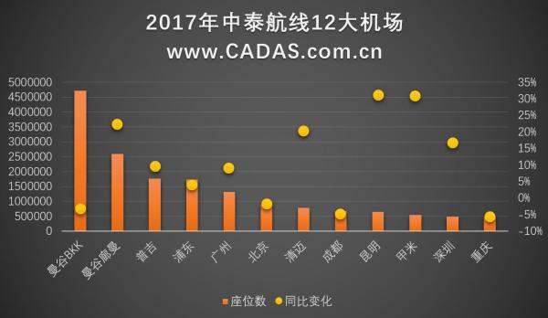 从中泰市场运营的机场观察,曼谷2个机场与北京首都、浦东、广州机场的中泰航线座位投放占中泰航线总座位超过50%。在中泰航线的12大机场中成都机场与重庆机场在2017年中泰航线运力投放同比减少。昆明机场同比增速最快。