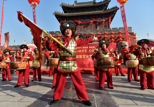 2018年2月6日,在“过大年回老家 文明旅游看河南”开封主会场启动仪式上,演员在开封府景区前表演开封盘鼓。新华社发