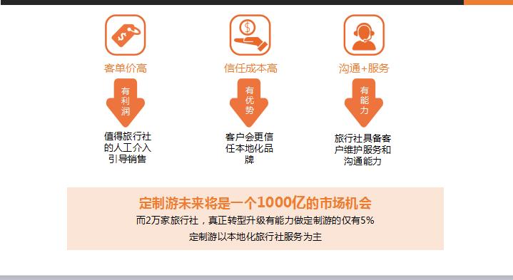 而定制游是因为客户关系,他们本身需要第三方服务,而且需求个性化。这从根本上来说,是属于本地化旅行社的机会,但可惜的是过去很多旅行社和销售放掉这一领域的客人,甚至强行扭转客人意愿鼓励其参团。这才给了OTA们做定制游平台和创业公司崛起的机会。