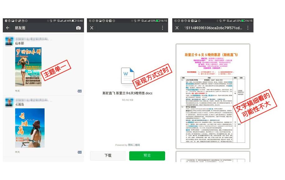 批发商们,其实一部分已经开始转型和升级,但大部分依然是一批同业销售,通过各种线上线下的管道去转发线路海报,他们在产品设计思维上甚至不如创业公司。哪怕是做同业销售海报,都要用草料去生成二维码,丑得惊心动魄,low得别出心裁。很多品牌批发商也在发力,但历史包袱太重,他们和旅行社们的关系也多是貌合神离。因为要靠旅行社销售分发,所以批发商们也是断不敢将手伸得太长,虽然这种伸手的情况也时有发生,让旅行社们恶心。