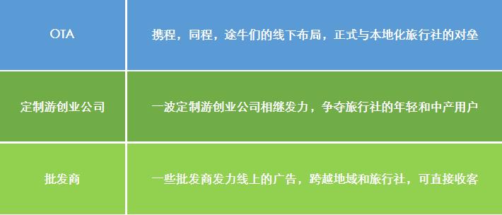 在某种意义上,OTA,创业公司和批发商都有自己的核心优势:OTA有线上流量优势,创业公司有创意和设计的基因,批发商有资源优势。反过来,传统旅行社在过去这么多年,看似一起造出了一个4000亿的市场,但行业两万多旅行社,数十万的门店和销售,拆分开来一个个都非常势单力薄。