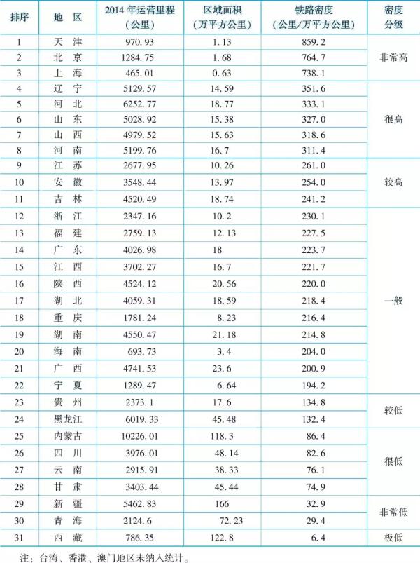 按省域面积计算,天津、北京、上海的铁路密度最高,分别为859.2公里/万平方公里、764.7公里/万平方公里、738.1公里/万平方公里;西藏、青海、新疆的铁路密度最低,分别为6.4公里/万平方公里、29.4公里/万平方公里、32.9公里/万平方公里。