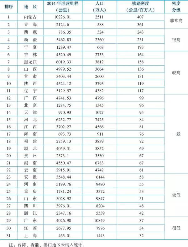 按省域人口计算,内蒙古、青海、西藏的铁路密度最高,分别为407公里/百万人、361公里/百万人、243公里/百万人;上海、江苏、广东的铁路密度最低,分别为32公里/百万人、34公里/百万人、37公里/百万人(见表2)。