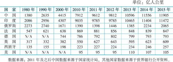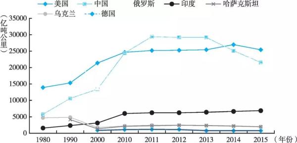 货运周转量方面,美国、中国与俄罗斯保持世界前三。中国自2012年后逐渐下降,2015年居世界第三。美国2015年也比2014年下降,以25473亿吨公里居世界之首。从图表中可以看出,苏联国家货运周转量自1980年开始后明显萎缩(见表5、图3)。