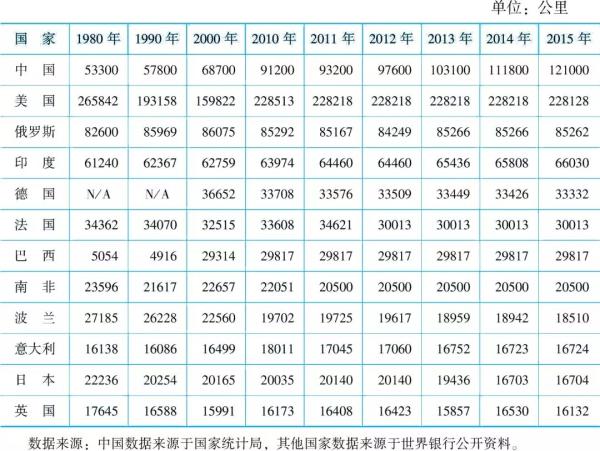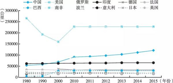 美国铁路一直保持全球最长,2015年以约22.8万公里里程明显高于其他国家。中国铁路里程明显比其他国家增速快,在20世纪90年代与21世纪初分别超过印度、俄罗斯,2015年底为约12.1万公里居世界第二。俄罗斯铁路里程2015年底约为8.5万公里,居世界第三(见表3、图1)。
