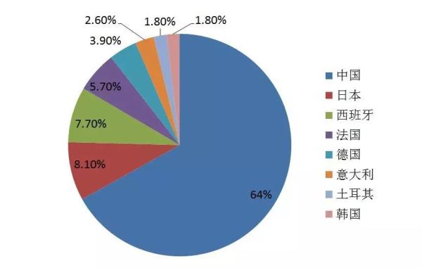 2016年世界上共有16个国家和地区运营高铁,运营总里程为37343公里,其中中国23914公里,约占全球的64%,其次分别是日本(约占8.1%)、西班牙(约占7.7%)(见表6、图4)。
