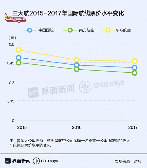 根据财报数据,2017年,国航、东航和南航国际航线客运人公里收入(利润指标)再度出现集体下滑。具体来看,2017年,国航、东航在其经营的国际航线上,运输一名旅客一公里仅进账0.4111、0.462元,拥有亚洲第一大机队的南航更是下滑至只有0.37元。
