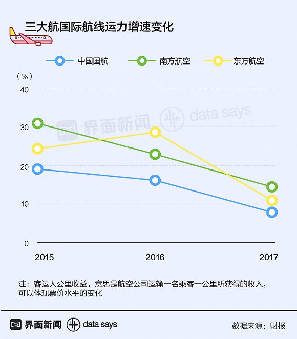 也正是从去年开始,三大航明显放缓了开拓国际航线的节奏,而是将视线重新移回国内。财报数据显示,国航、东航和南航去年国际航线运力增速只有2016年的一半左右,国航增长7.8%,东航增长10.96%,南航增长14.28%。
