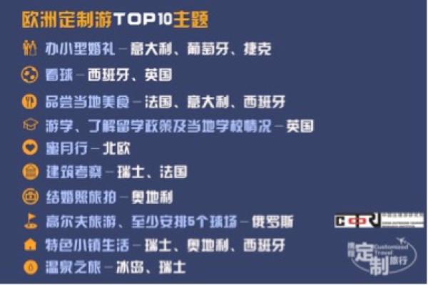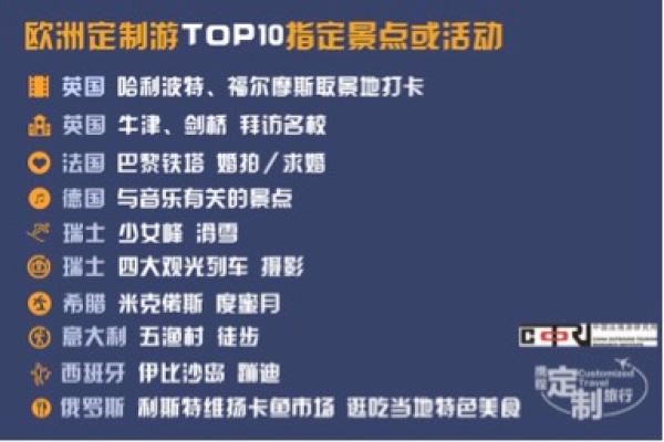 中国出境定制游游客占比40%,而欧洲定制游占出境定制游10%,需求单量同比增长130%。报告统计数据显示,定制客人出行欧洲人次排名最高的前十大热门国家为:英国、意大利、法国、俄罗斯、希腊、西班牙、德国、瑞士、捷克、奥地利。