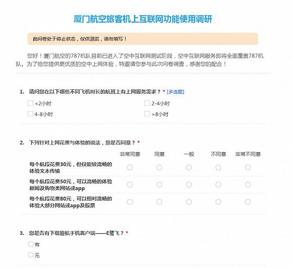 而据记者了解,目前包括东航在内的内地航空公司,也已经在研究探讨可行的收费模式。前段时间,厦门航空就发布了一份关于机上互联上网功能使用的调研问卷,其中在收费形式上列出了三种选择:每个航段花费30元,但只够较流畅地体验文字传输;每个航段50元,可以流畅地体验新闻及购物网站或App;每个航段80元,可以相对流畅的体验大部分网站或App及股票。
