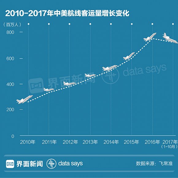 “在2009年之前,从中国前往美国的游客数量在20至40万之间波动,但是2010年市场突然爆发,赴美热情急剧高涨,游客增速高达50%,之后每年的增速为36%、36%、25%、24%。2016年的增速也达到17%,去年的数据还没出来,但是应该要比这低一些。”戴亚斯(Walter Dias)说,他担任美联航大中华区及韩国董事总经理已经有7年,见证了中美航线的起起伏伏。