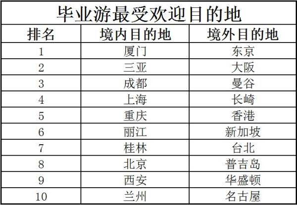 毕业游以国内为主,厦门、三亚、成都位列最受喜爱国内目的地前三,紧随其后的为上海、重庆、丽江、桂林、北京、西安、兰州。多个城市和景点因为小视频爆红,符合年轻人追求潮流、表达个性的出行主张。