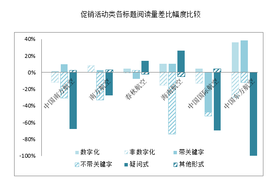 就促销类文章,图表显示出数字化和特价类的标题特别受宠。除南方航空微信号外,整体上数字化标题对于用户的吸引力均明显大于非数字化标题。而除国航微信号外,整体上带关键字标题的文章平均阅读量偏高。在各司促销活动类推文中,阅读量达到5万以上的93篇文章中“xx元起”、“免费”、“特惠”等字眼有较高使用率,分别达到32.26%、9.68%、8.60%。疑问式标题则以春秋、海航为代表,收获的阅读量超出平均水平,其他微信号因发文量寥寥无几,未有显著效果。