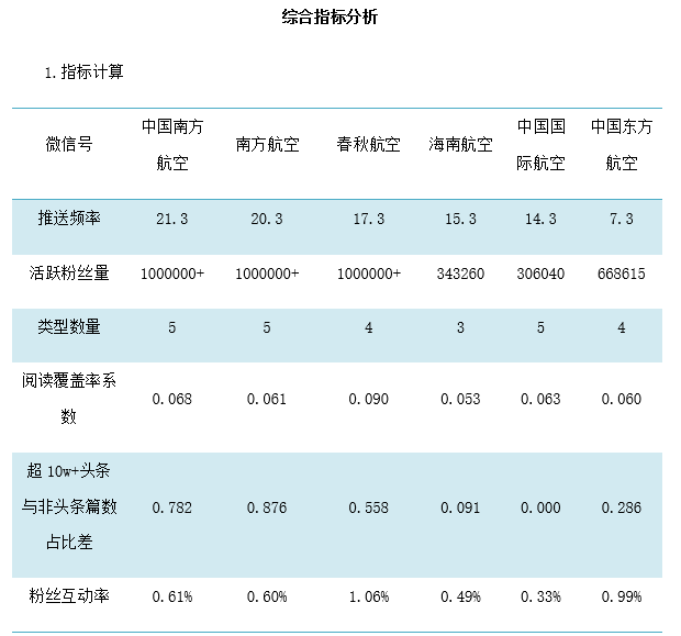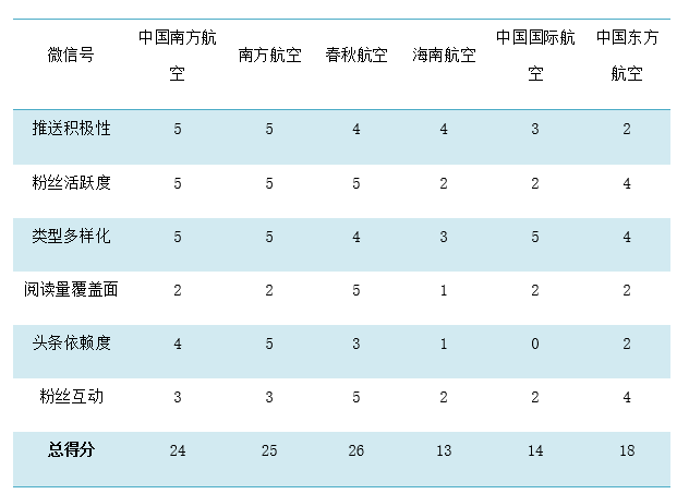 最后,结合各航司的综合运用效果,根据基本表现情况,设定6个维度的评分指标,以此计算综合得分排名(详见附表)。春秋航空在七大吸引力着力点基本都涵盖了,获得较高的阅读覆盖率和粉丝互动率,综合排名榜首。其他航司可以尝试继续突破专长或针对自身薄弱的环节努力攻克,灵活运用各要素再结合航司自身优缺点,查漏补缺;同时,伴随着微信应用不断更新改版,时刻关注行业动态走向,运用大数据思维及时调整优化推广策略,最大化利用微信推广的平台,从而吸引更多用户关注,提高粉丝经济效益。