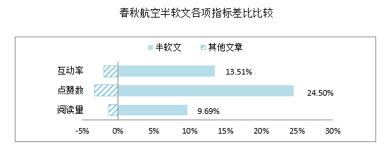 春秋航空粉丝互动率是统计标的中唯一超1%的,以其为例,在第一季度的推文中,有超过半数的文章阅读量达10万+,头条文章全员出线,整体覆盖率达9%,居于榜首。其内容多采用半软文式营销方式,即在开头以相对轻松的内容做铺垫,引出要推广的航班价格信息,配上一些航线城市的风景之类的内容等,搭配广告穿插,阅读起来流畅平顺,推广不生硬。统计结果显示,半软文各项差值比远远大于其他文章。