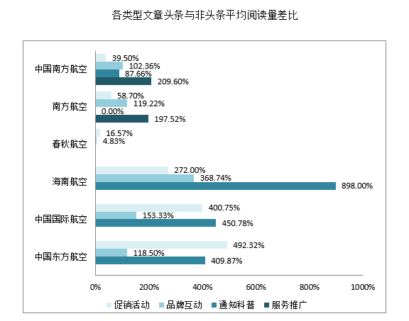 一直以来,头条都是各大航司的兵家必争之地。纵观各航司微信号,各类型头条文章平均阅读量均高于非头条文章。由此可见,微信营销中头条有着重要的战略地位。